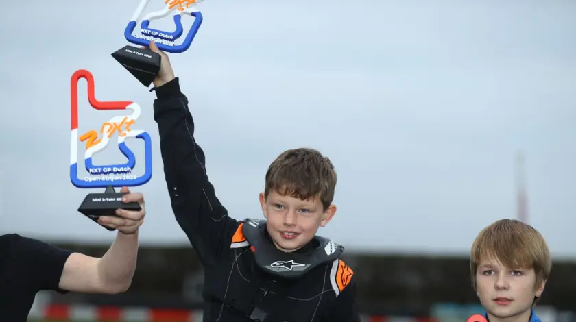 Met deze overwinning sluit Mike een sterk seizoen af in de Mini 60cc-klasse. Alleen de finale van het NXT GP-kampioenschap in Assen rest nog. 'Dat wordt lastig, maar ik ga er alles aan doen om weer op het podium te komen.'