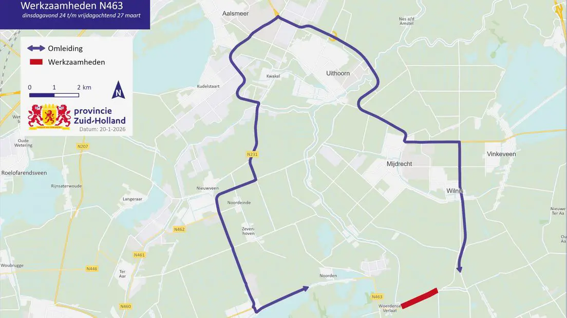 WOERDENSE VERLAAT - De provincie Zuid-Holland werkt aankomende dinsdag tot vrijdag aan de Lange Meentweg bij Woerdense Verlaat. De weg is elke nacht afgesloten tussen 20.00 uur en 6.00 uur. De omleidingsroute tijdens de werkzaamheden is meer dan 33 kilometer. Na de werkzaamheden wordt de snelheid verlaagd tot zestig kilometer per uur.