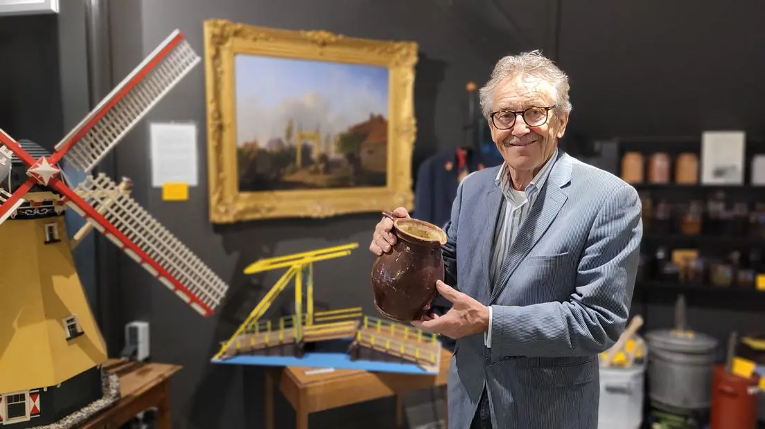 Flip Vonk toont een Langeraarse stroopkan in het dorpsmuseum van Ter Aar