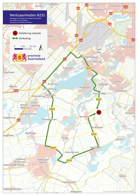 De provincie Zuid-Holland gaat namelijk onderhoud uitvoeren aan de rotonde. Van 26 november tot en met 29 november is de rotonde bij Nieuwveen drie nachten afgesloten. Het gaat om de tijdstippen 20.00 uur tot 06.00 uur.