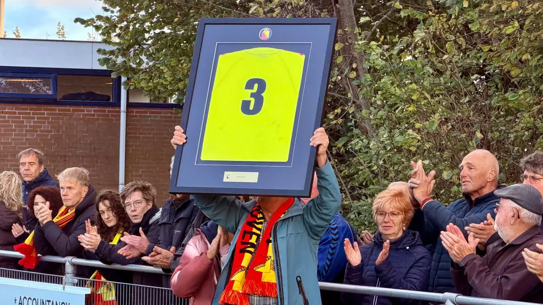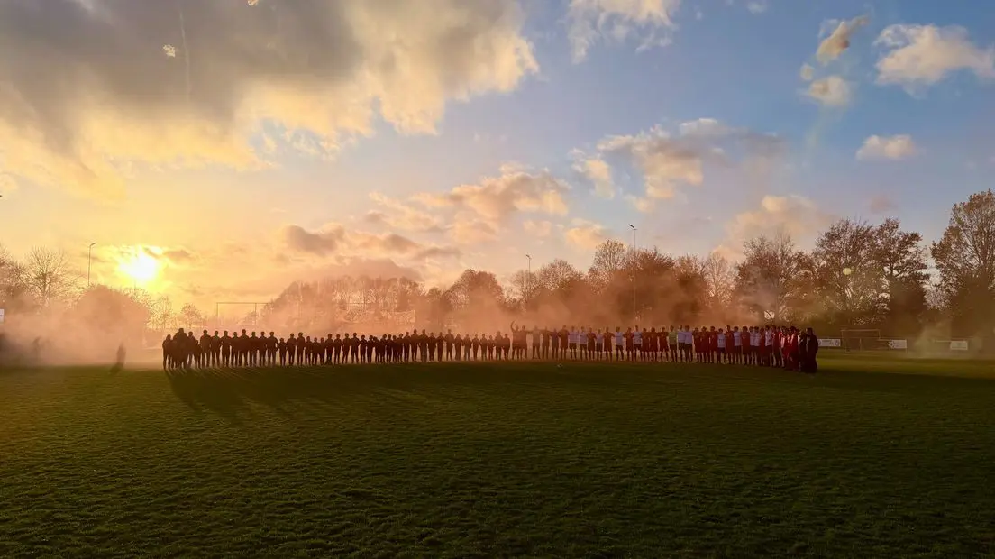 ZEVENHOVEN - Vuurwerk, muziek en daarna een oorverdovende stilte als het vriendenteam de 28-jarige Jacco herdenkt bij S.V. Zevenhoven. Jacco kwam om bij een woningbrand. Hartverscheurend is het moment waarop twee beste vrienden na de minuut stilte een groot schilderij aan de ouders overhandigen. Na een omhelzing komt de broer van Jacco erbij, die ook in het team speelt, waarna de vader het schilderij onder luid applaus boven zijn hoofd houdt.