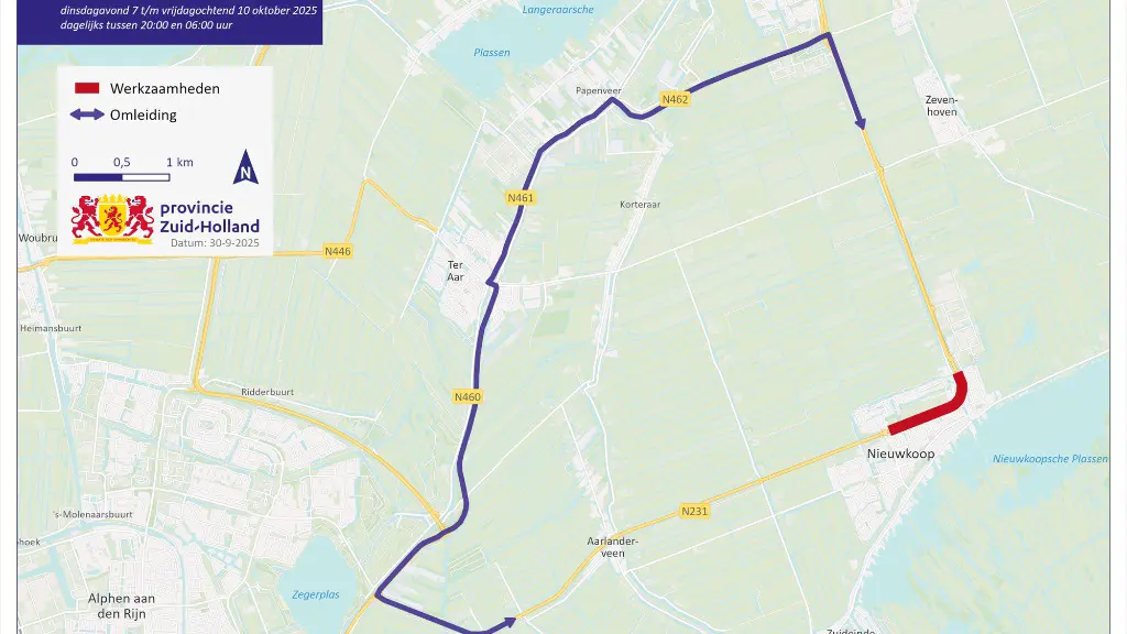 NIEUWKOOP - Van dinsdag 7 oktober tot en met vrijdagochtend 10 oktober 2025 voert de provincie onderhoud uit aan de Provincialeweg (N231) in Nieuwkoop. De werkzaamheden vinden ’s nachts plaats, tussen 20.00 uur en 06.00 uur. In die nachten is de weg afgesloten en wordt het verkeer omgeleid.